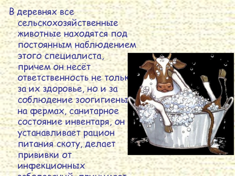 Слайд 18В деревнях все сельскохозяйственные животные находятся под постоянным наблюдением этого специалиста,
