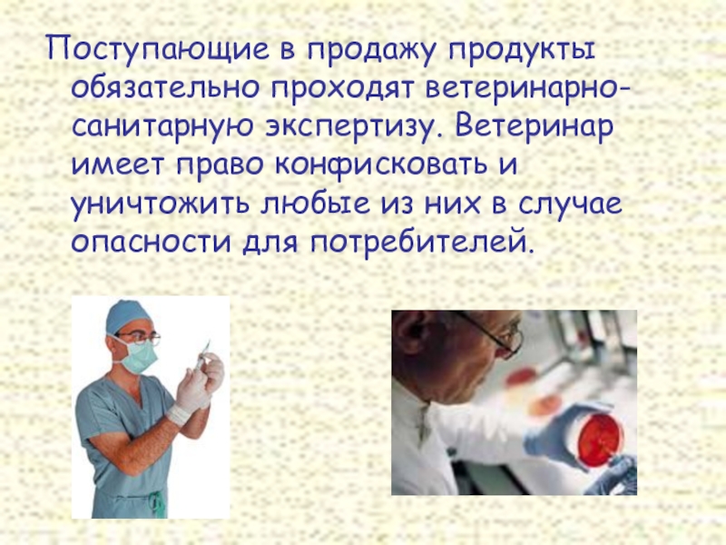 Слайд 19Поступающие в продажу продукты обязательно проходят ветеринарно-санитарную экспертизу. Ветеринар имеет право