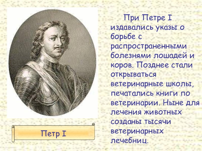 Слайд 12 При Петре I издавались указы о борьбе с распространенными болезнями лошадей
