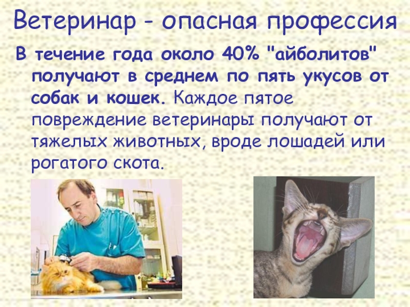 укусов от собак и кошек. Каждое пятое повреждение ветеринары получают от тяжелых животных, вроде лошадей или рогатого скота.