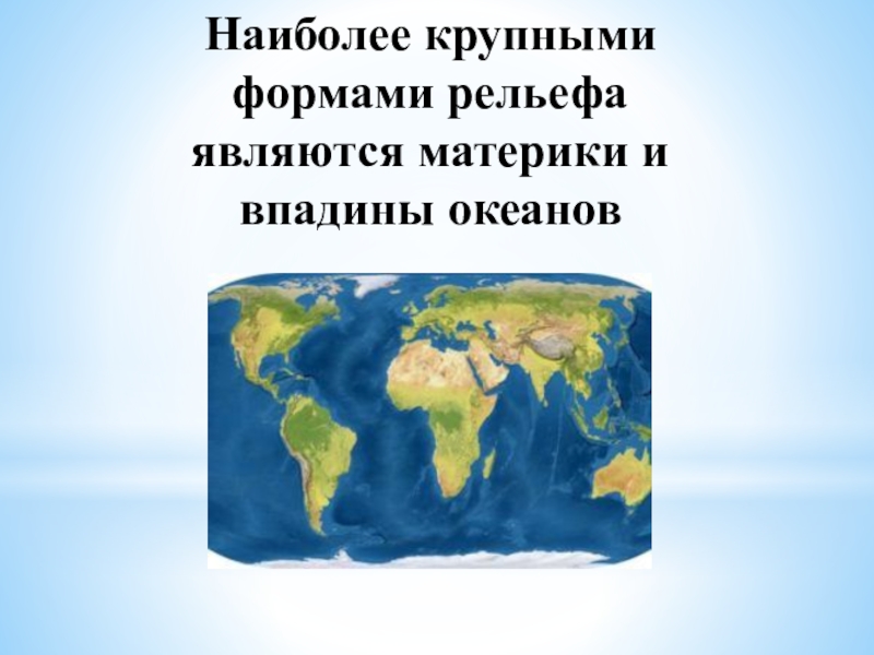 Слайд 2Наиболее крупными формами рельефа являются материки и впадины океанов