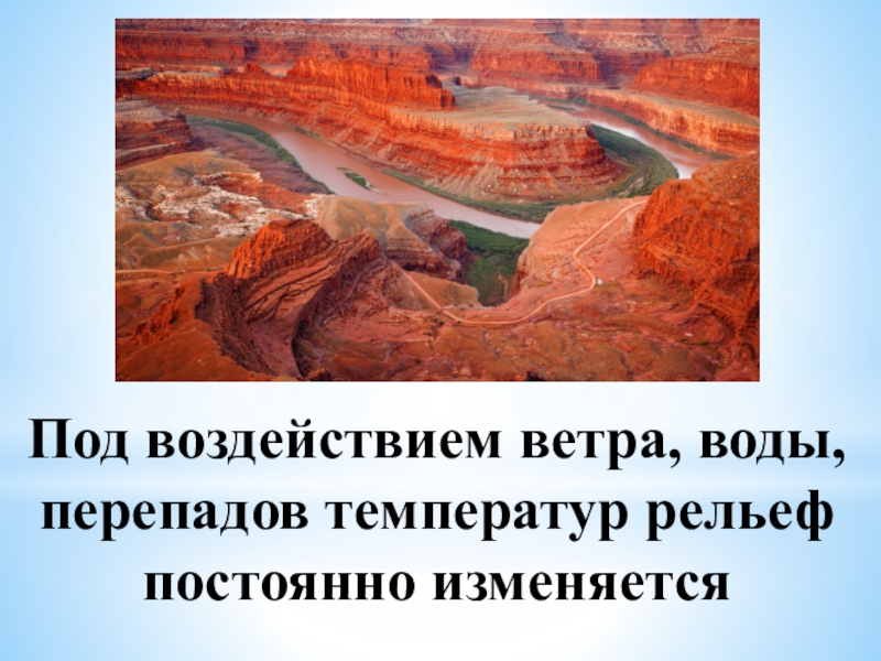 Слайд 10Под воздействием ветра, воды, перепадов температур рельеф постоянно изменяется