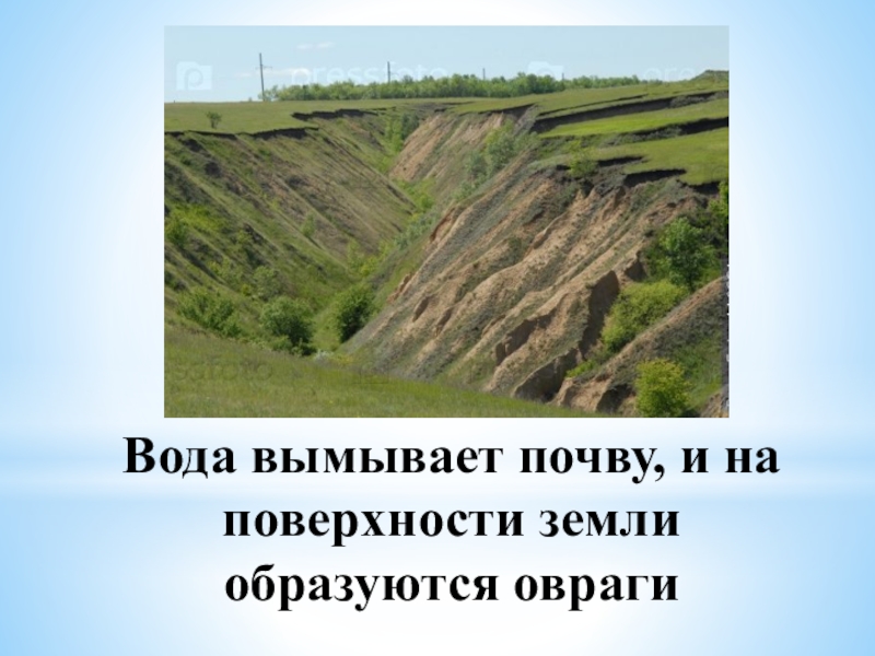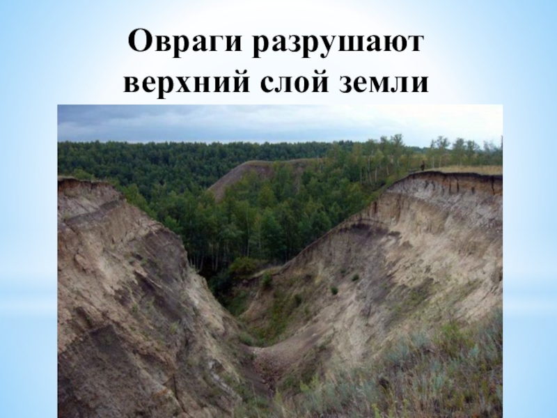 Слайд 11Вода вымывает почву, и на поверхности земли образуются овраги