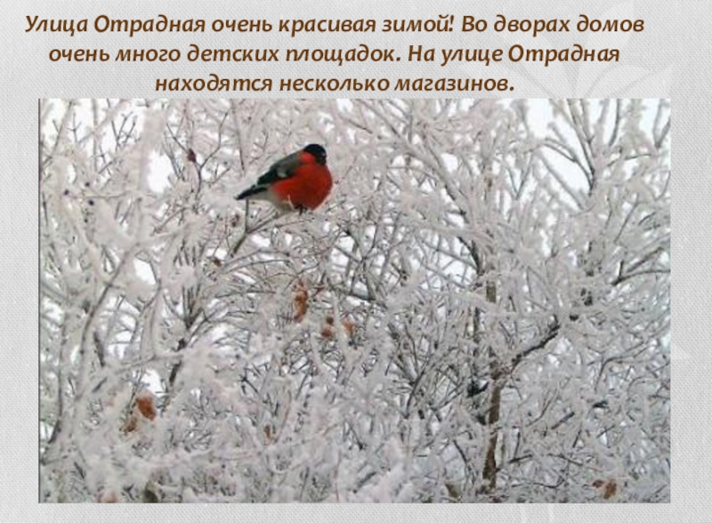 Слайд 4Улица Отрадная очень красивая зимой! Во дворах домов очень много детских