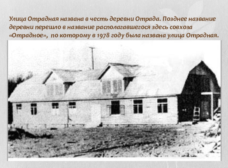 Слайд 3Улица Отрадная названа в честь деревни Отрада. Позднее название деревни перешло
