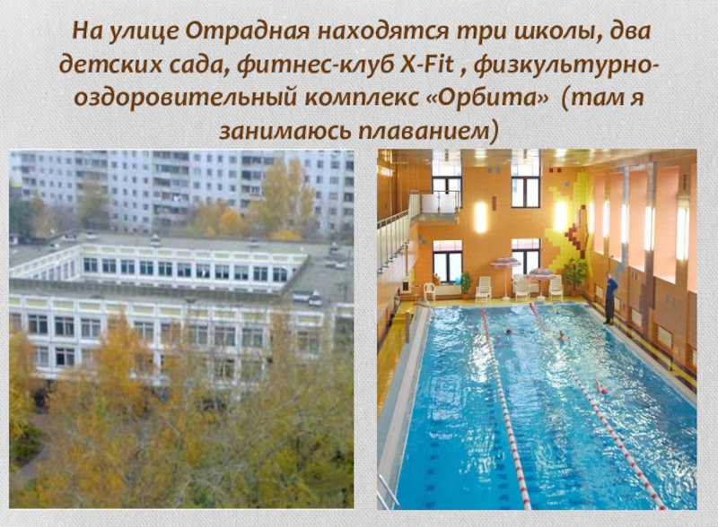 Слайд 6 На улице Отрадная находятся три школы, два детских сада, фитнес-клуб