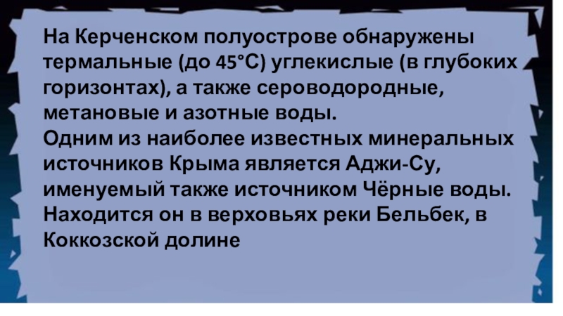 Слайд 22На Керченском полуострове обнаружены термальные (до 45°С) углекислые (в глубоких горизонтах),
