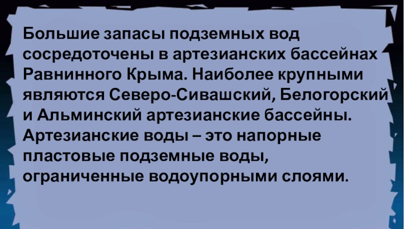 Слайд 21Большие запасы подземных вод сосредоточены в артезианских бассейнах Равнинного Крыма. Наиболее