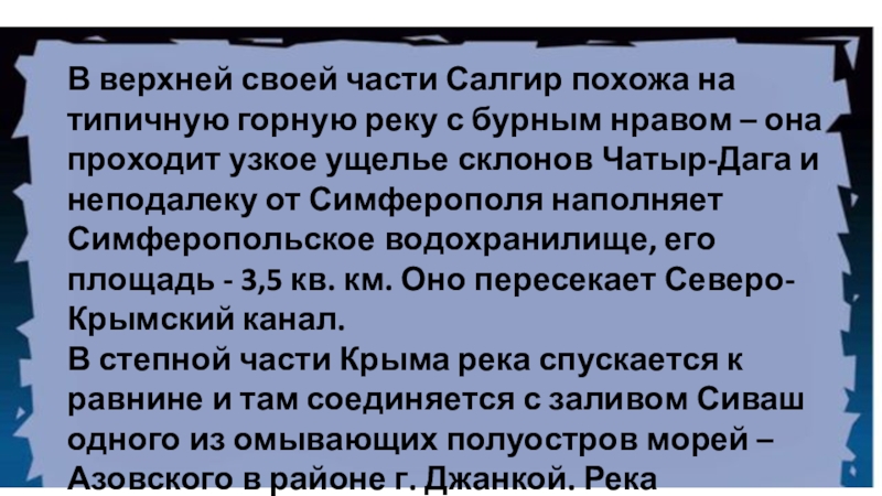 бурным нравом – она проходит узкое ущелье склонов Чатыр-Дага и неподалеку от Симферополя наполняет Симферопольское водохранилище, его площадь - 3,5 кв. км. Оно пересекает Северо-Крымский канал.