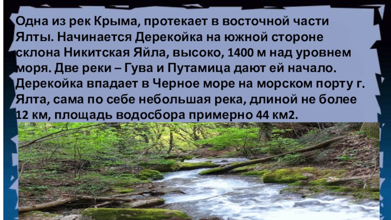 Слайд 26Одна из рек Крыма, протекает в восточной части Ялты. Начинается Дерекойка