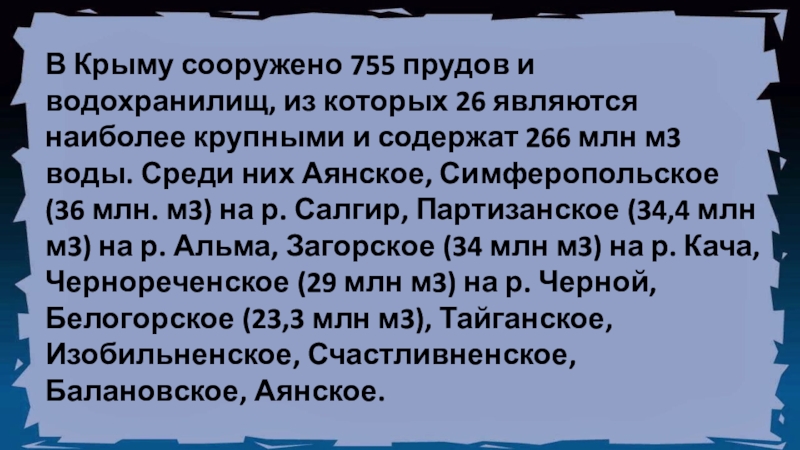 наиболее крупными и содержат 266 млн м3 воды. Среди них Аянское, Симферопольское (36 млн. м3) на р. Салгир, Партизанское (34,4 млн м3) на р. Альма, Загорское (34 млн м3) на р. Кача, Чернореченское (29 млн м3) на р. Черной, Белогорское (23,3 млн м3), Тайганское, Изобильненское, Счастливненское, Балановское, Аянское.