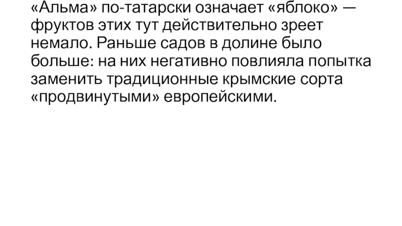 «Альма» по-татарски означает «яблоко» — фруктов этих тут действительно зреет немало. Раньше садов в долине было больше: на них негативно повлияла попытка заменить традиционные крымские сорта «продвинутыми» европейскими.