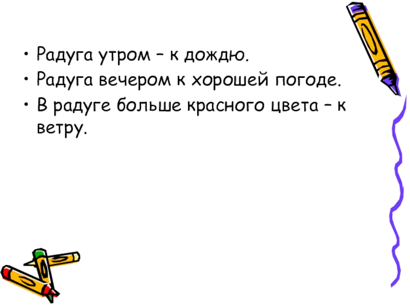 Радуга утром – к дождю.Радуга вечером к хорошей погоде.В радуге больше красного цвета – к ветру.