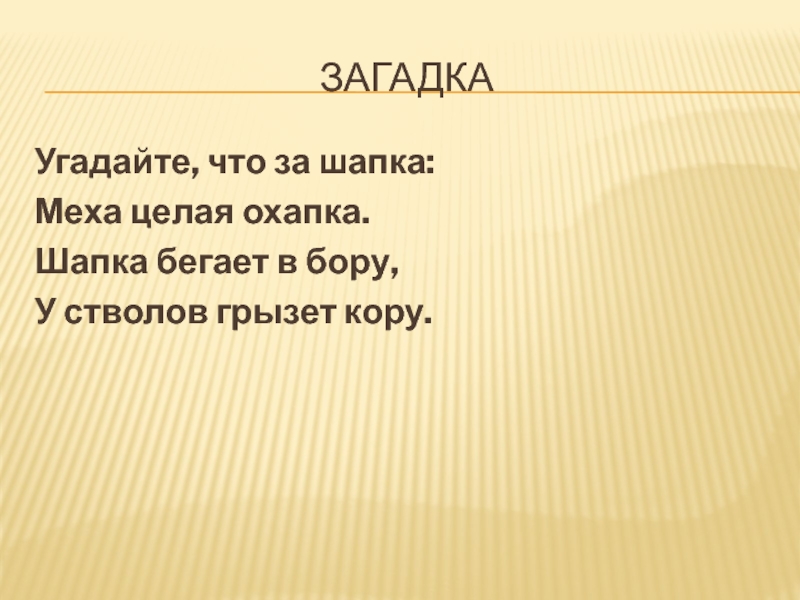 ЗагадкаУгадайте, что за шапка:Меха целая охапка.Шапка бегает в бору,У стволов грызет кору.