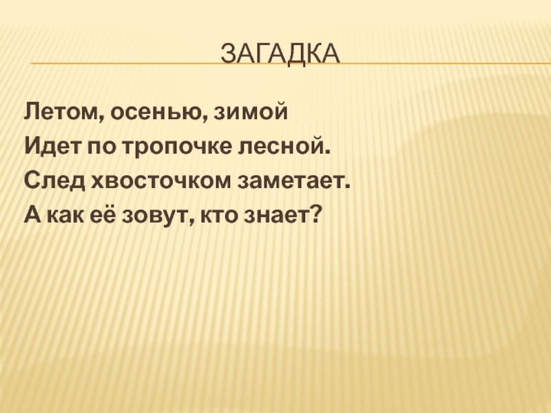 загадкаЛетом, осенью, зимойИдет по тропочке лесной.След хвосточком заметает.А как её зовут, кто знает?