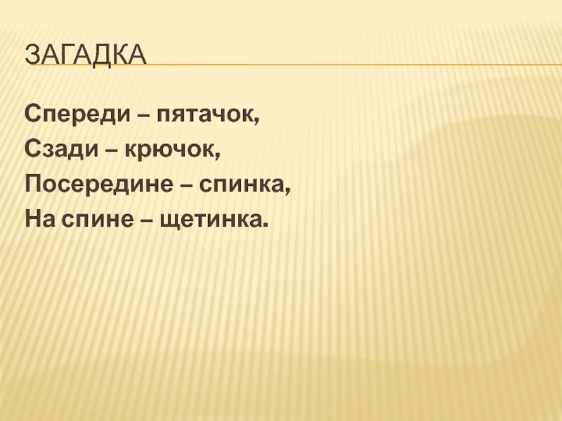 ЗагадкаСпереди – пятачок, Сзади – крючок, Посередине – спинка, На спине – щетинка.