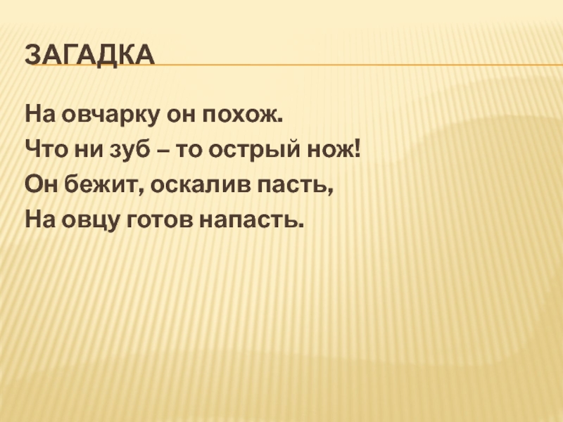 ЗагадкаНа овчарку он похож. Что ни зуб – то острый нож! Он бежит, оскалив пасть, На овцу