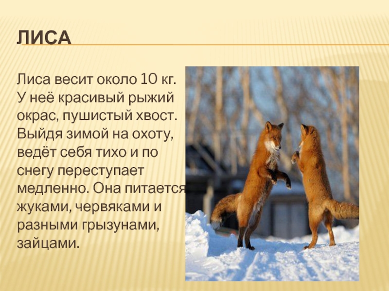 лисаЛиса весит около 10 кг. У неё красивый рыжий окрас, пушистый хвост. Выйдя зимой на охоту, ведёт