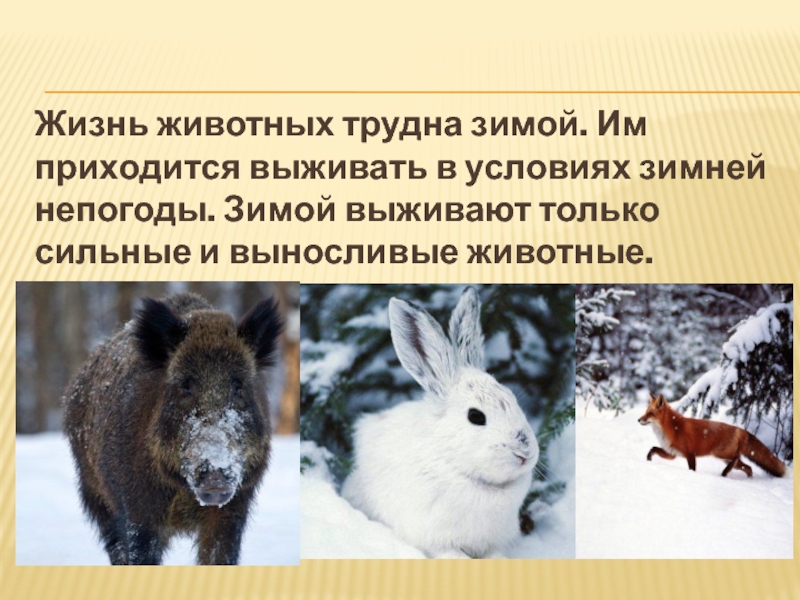 Слайд 12Жизнь животных трудна зимой. Им приходится выживать в условиях зимней непогоды.