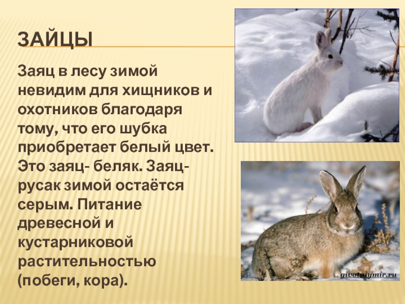 что его шубка приобретает белый цвет. Это заяц- беляк. Заяц-русак зимой остаётся серым. Питание древесной и кустарниковой растительностью (побеги, кора).