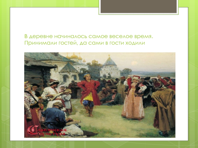 Слайд 18В деревне начиналось самое веселое время. Принимали гостей, да сами в