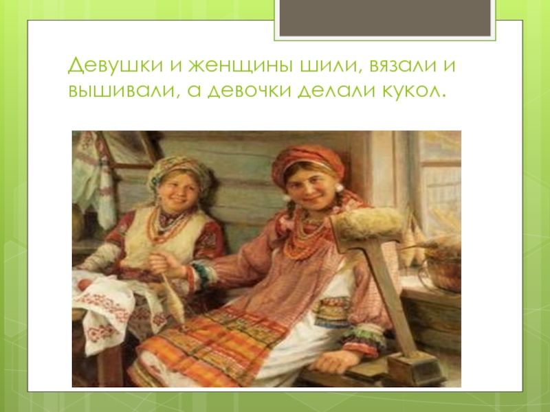 Слайд 19Девушки и женщины шили, вязали и вышивали, а девочки делали кукол.