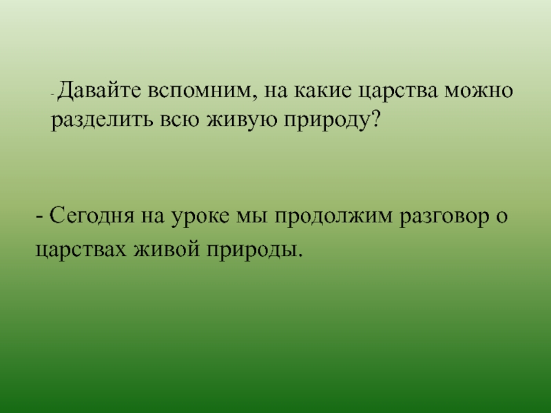 - Давайте вспомним, на какие царства можно разделить всю живую природу?