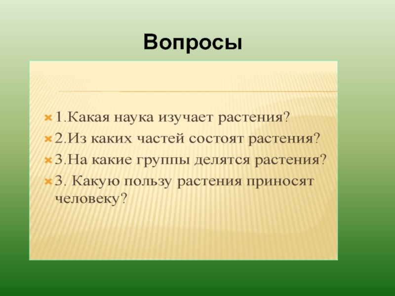 Вопросы:   1.     Верно ли, что наука, изучающая растения называется ботаникой?   2.     У мхов есть корень, стебель,