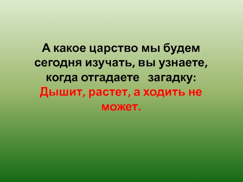 А какое царство мы будем сегодня изучать, вы узнаете, когда отгадаете  загадку: Дышит, растет, а ходить