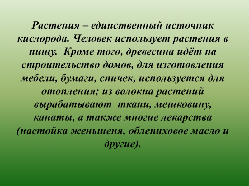 Растения – единственный источник кислорода. Человек использует растения в пищу.  Кроме того, древесина идёт на строительство домов,