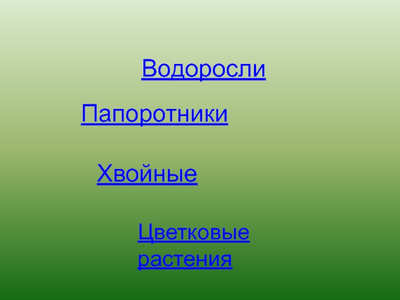 Водоросли   Папоротники Хвойные Цветковые растения