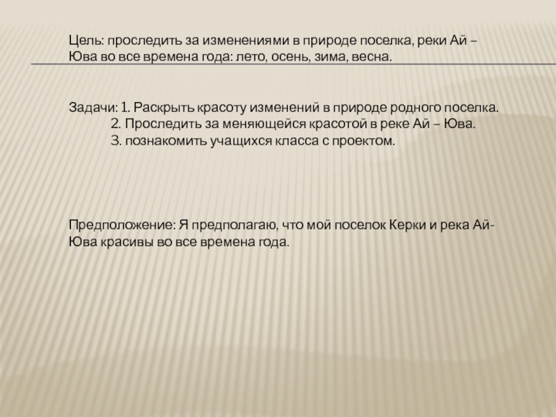Цель: проследить за изменениями в природе поселка, реки Ай – Юва во все времена года: лето, осень, зима, весна.  Задачи: 1. Раскрыть красоту изменений в природе родного поселка. 2. Проследить за