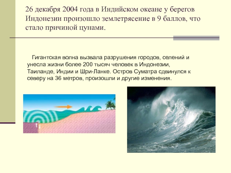 Гигантская волна вызвала разрушения городов, селений и унесла жизни более 200 тысяч человек в Индонезии, Таиланде, Индии и Шри-Ланке. Остров Суматра сдвинулся к северу на 36 метров, произошли и другие изменения.