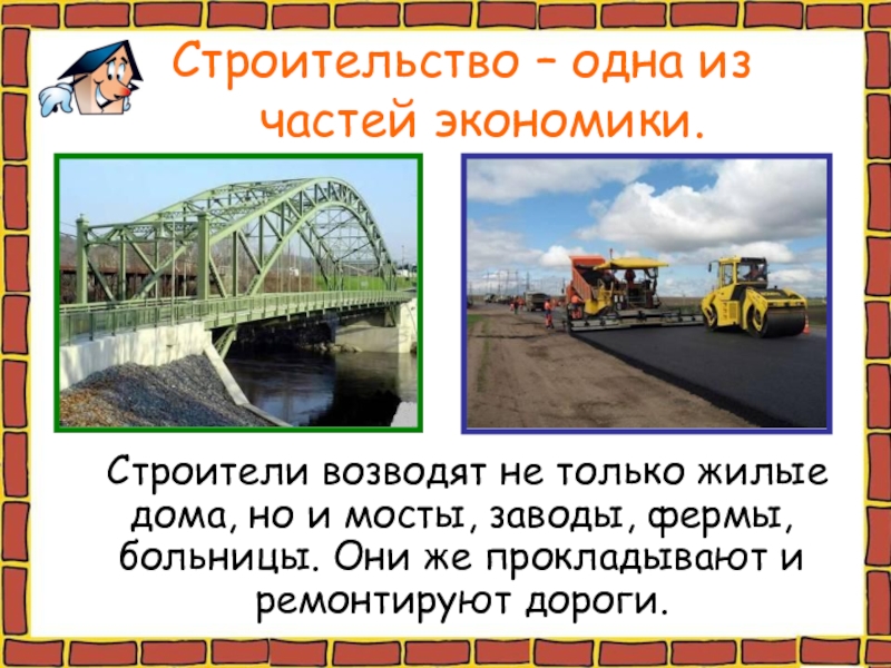 Строители возводят не только жилые дома, но и мосты, заводы, фермы, больницы. Они же прокладывают и ремонтируют дороги.