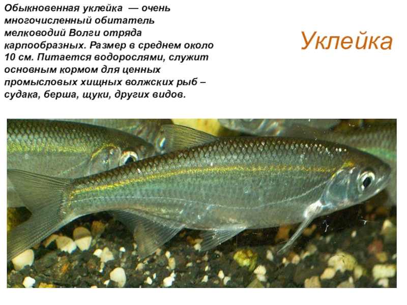 УклейкаОбыкновенная уклейка — очень многочисленный обитатель мелководий Волги отряда карпообразных. Размер в среднем около 10 см. Питается