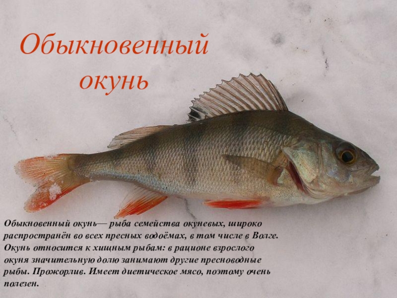 водоёмах, в том числе в Волге. Окунь относится к хищным рыбам: в рационе взрослого окуня значительную долю занимают другие пресноводные рыбы. Прожорлив. Имеет диетическое мясо, поэтому очень полезен.