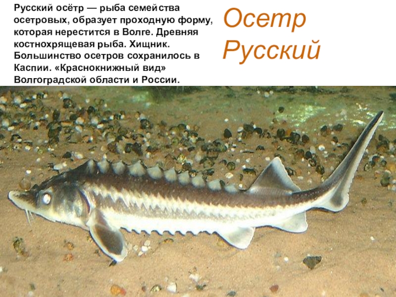 Осетр РусскийРусский осётр — рыба семейства осетровых, образует проходную форму, которая нерестится в Волге. Древняя костнохрящевая рыба. Хищник. Большинство осетров сохранилось в Каспии. «Краснокнижный вид» Волгоградской области и России.