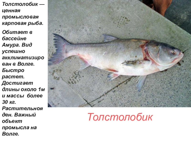 ТолстолобикТолстолобик — ценная промысловая карповая рыба. Обитает в бассейне Амура. Вид