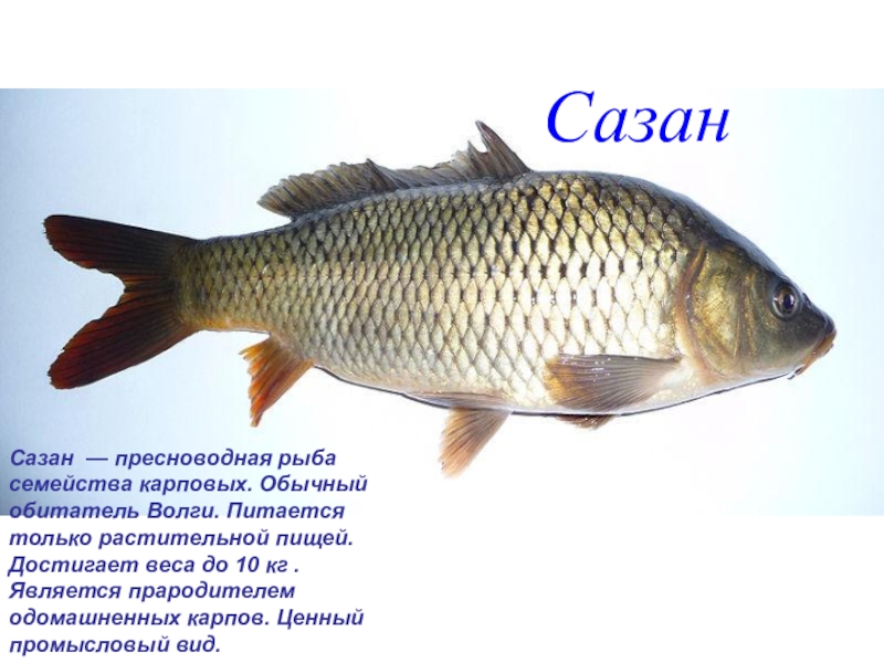 СазанСазан — пресноводная рыба семейства карповых. Обычный обитатель Волги. Питается только растительной пищей. Достигает веса до 10