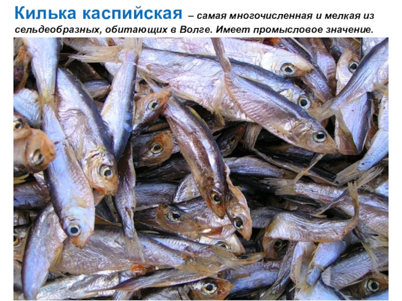 Слайд 5Килька каспийская – самая многочисленная и мелкая из сельдеобразных, обитающих в