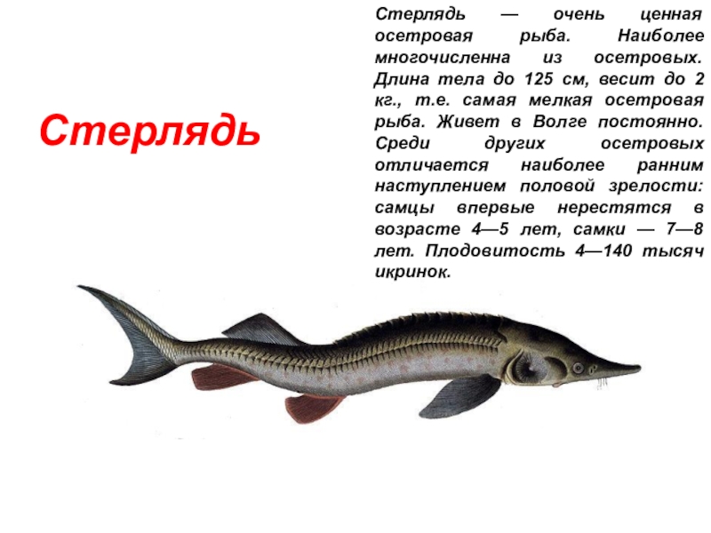 СтерлядьСтерлядь — очень ценная осетровая рыба. Наиболее многочисленна из осетровых. Длина тела до 125 см, весит до