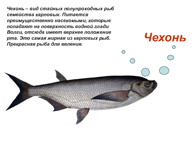 ЧехоньЧехонь – вид стайных полупроходных рыб семейства карповых. Питается преимущественно насекомыми, которые попадают на поверхность водной глади
