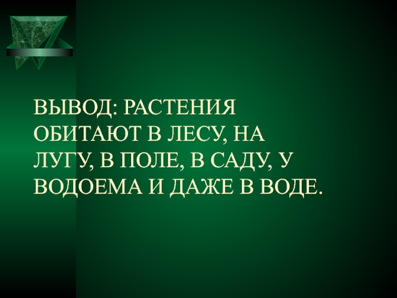 Слайд 6ВЫВОД: РАСТЕНИЯ ОБИТАЮТ В ЛЕСУ, НА ЛУГУ, В ПОЛЕ, В САДУ,
