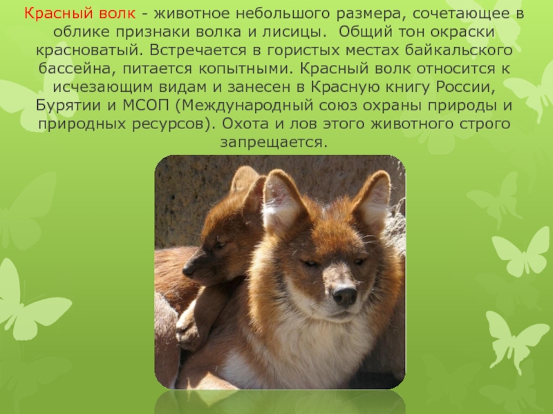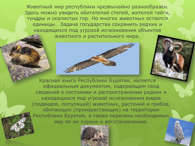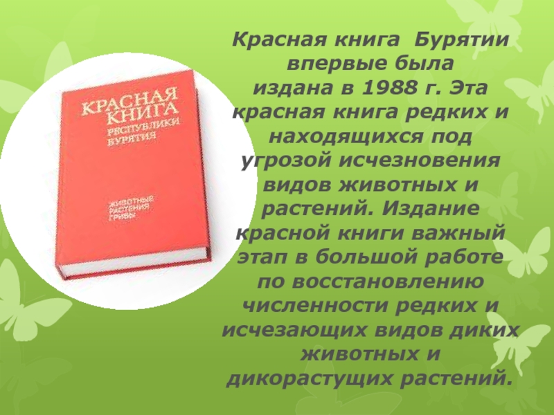 Красная книга Республики Бурятия, является официальным документом, содержащим свод сведений о состоянии и распространении редких и находящихся под угрозой исчезновения видов (подвидов, популяций) животных, растений и грибов, обитающих (произрастающих) на территории Республики Бурятия, а также перечень необходимых мер по их охране и восстановлению.