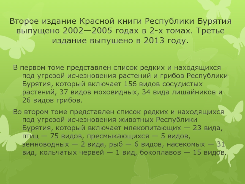 Во втором томе представлен список редких и находящихся под угрозой исчезновения животных Республики Бурятия, который включает млекопитающих — 23 вида, птиц — 75 видов, пресмыкающихся — 5 видов, земноводных — 2 вида, рыб — 6 видов, насекомых — 31 вид, кольчатых червей — 1 вид, бокоплавов — 15 видов.
