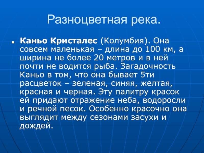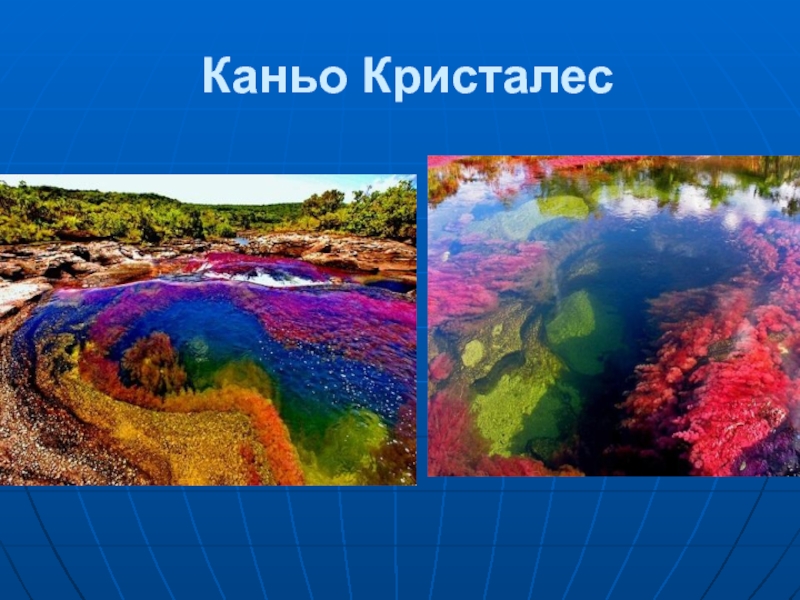 Разноцветная река.Каньо Кристалес (Колумбия). Она совсем маленькая – длина до 100 км, а ширина не более 20
