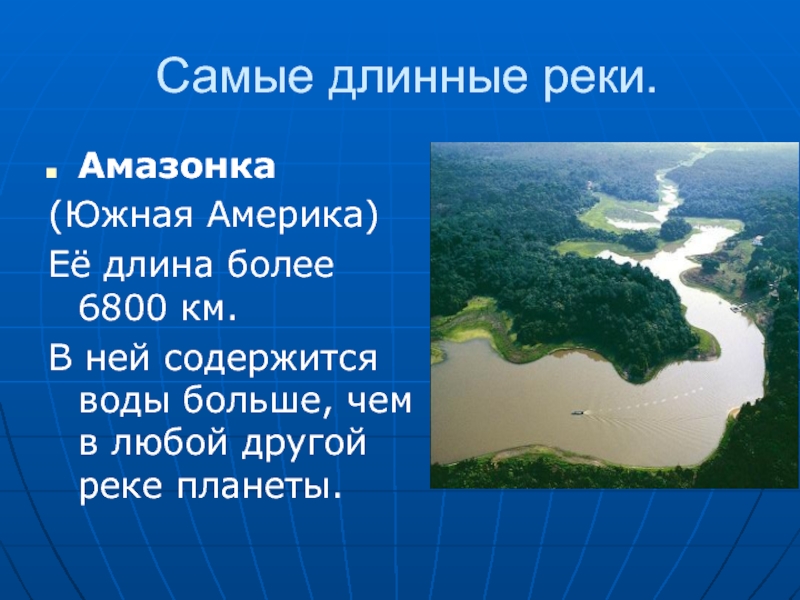 Самые длинные реки.Амазонка(Южная Америка)Её длина более 6800 км. В ней содержится воды больше, чем в любой другой