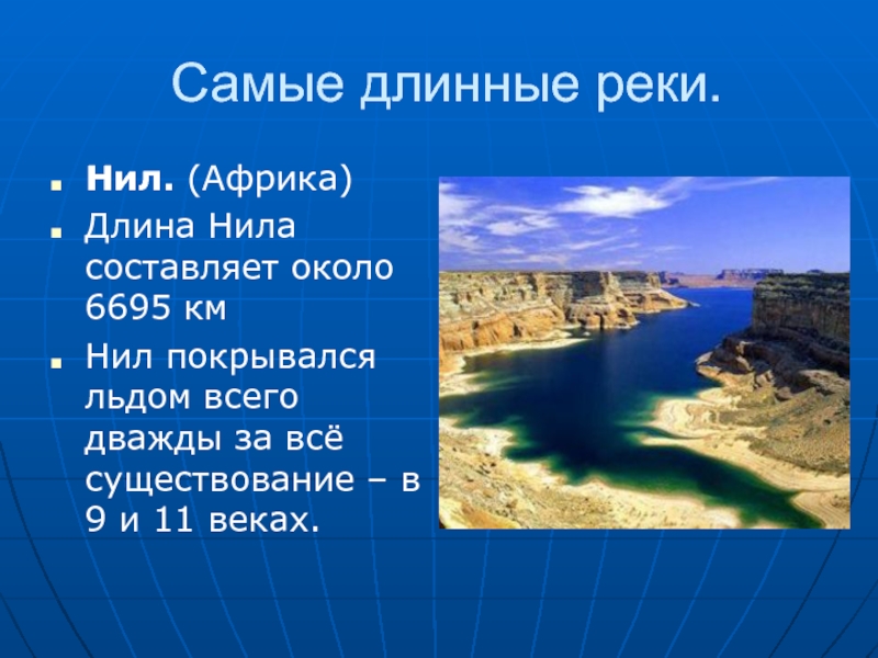 Самые длинные реки.Нил. (Африка)Длина Нила составляет около 6695 кмНил покрывался льдом всего дважды за всё существование – в 9 и 11 веках.