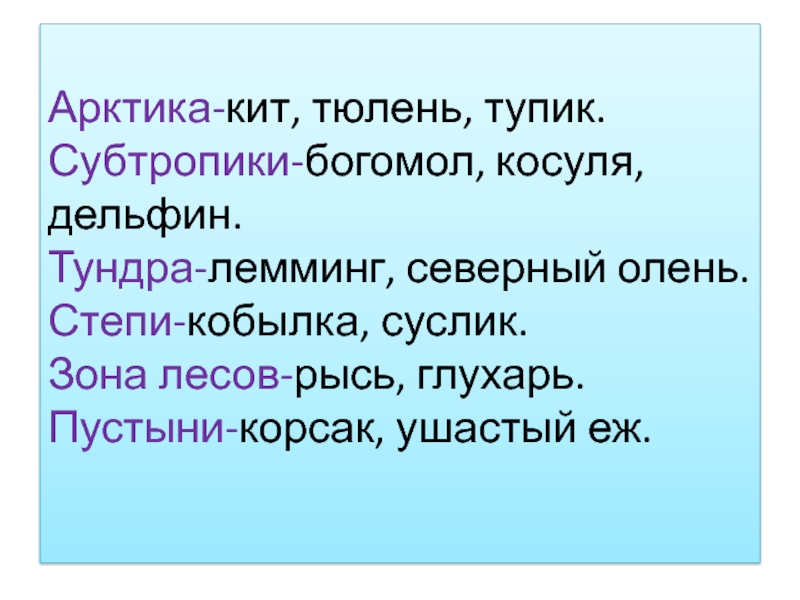 Слайд 4Арктика-кит, тюлень, тупик. Субтропики-богомол, косуля, дельфин. Тундра-лемминг, северный олень. Степи-кобылка, суслик. Зона лесов-рысь, глухарь. Пустыни-корсак, ушастый