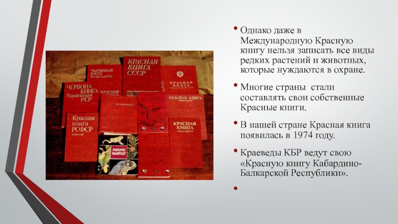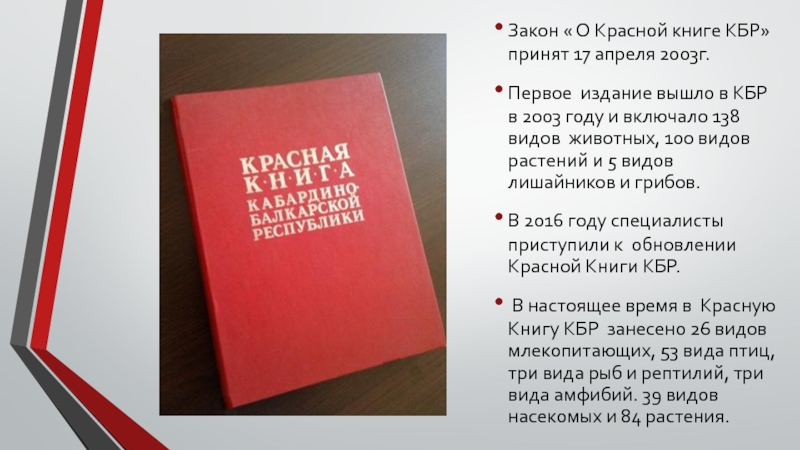 Слайд 7Закон « О Красной книге КБР» принят 17 апреля 2003г.